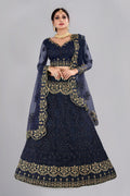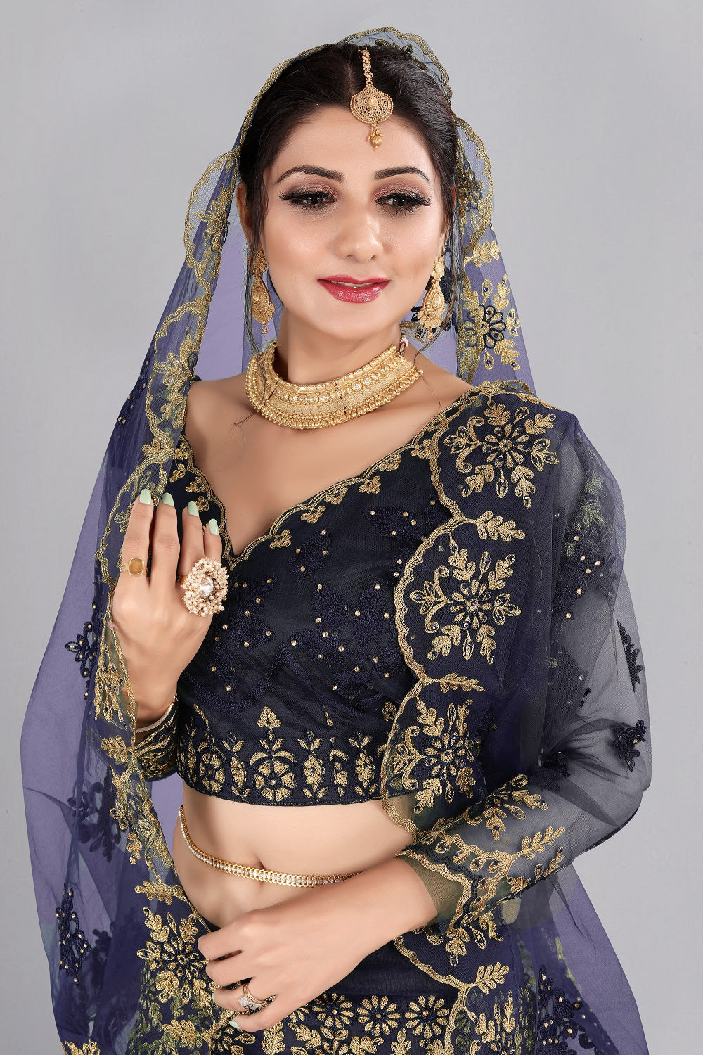 Blue net lehenga choli with satin lining is enhanced with a patch border, resham, zari, and stonework. This A Line Lehenga comes with the same color choli and dupatta crafted in sweetheart neck and quarter sleeve in similar work. The semi-stitched choli can be customized up to 42 inches. Do Note: All Accessories shown in the images are for styling purposes only and due to photographic reasons there might be slight color variation.