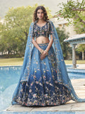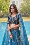Blue embroidered organza lehenga is enhanced with Resham, Zari, Dori, and Sequins Work. This designer lehenga comes along with the same color art silk choli and dupatta. The semi-stitched choli can be customized up to 42 inches. Do Note: All Accessories shown in the images are for styling purposes only and due to photographic reasons there might be slight color variation.