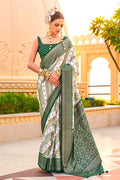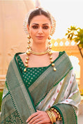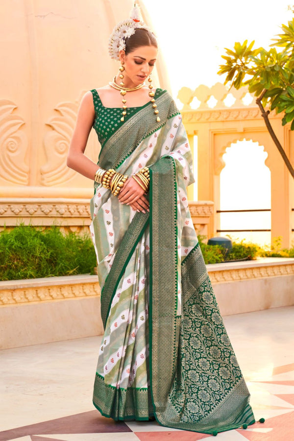 Dark Green and Off-White Foil Print Zari Woven Silk Saree