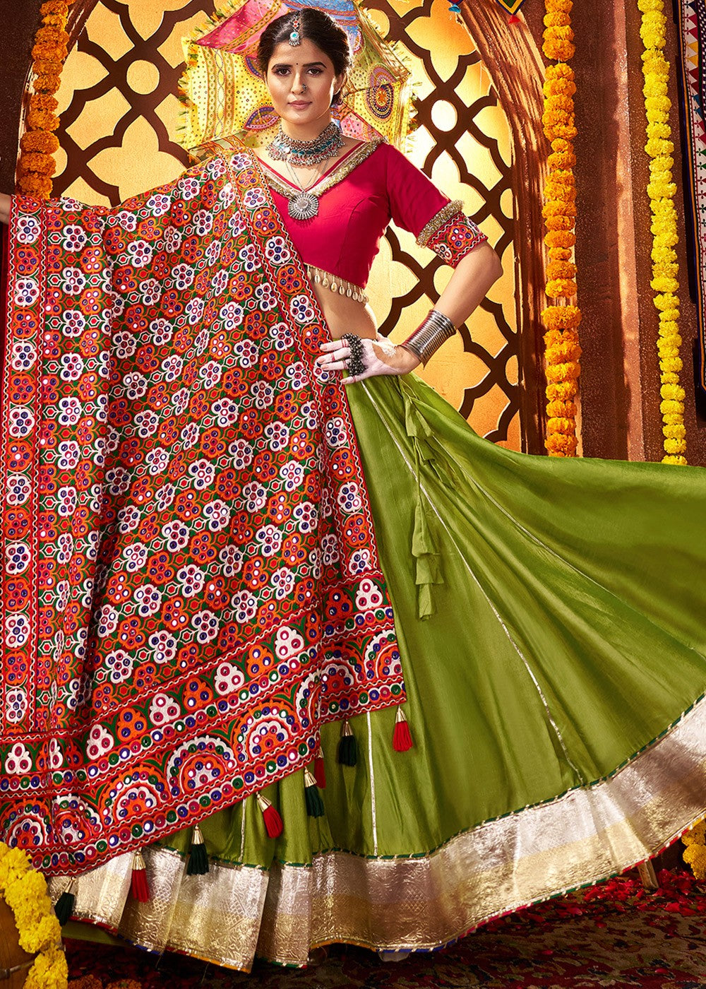 Make a statement this festive season with our Navratri Special Green Lehenga Choli. The lehenga is crafted from premium silk for a graceful fall, while the blouse is made with breathable viscose cotton for comfort. A soft cotton dupatta completes the look with subtle charm. Detailed with beautiful multi-thread embroidery and delicate mirror work, this outfit brings together traditional artistry and festive flair, perfect for dandiya, Garba, and every joyful celebration. Do Note: All Accessories shown in the images are for styling purposes only and due to photographic reasons there might be slight color variation.