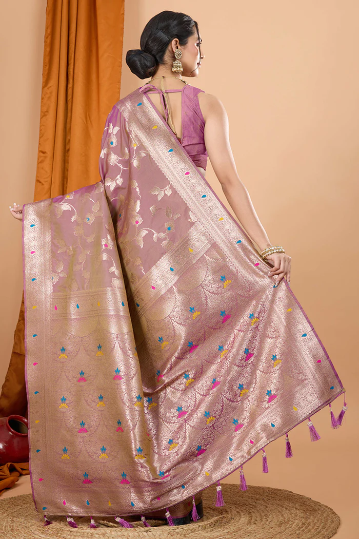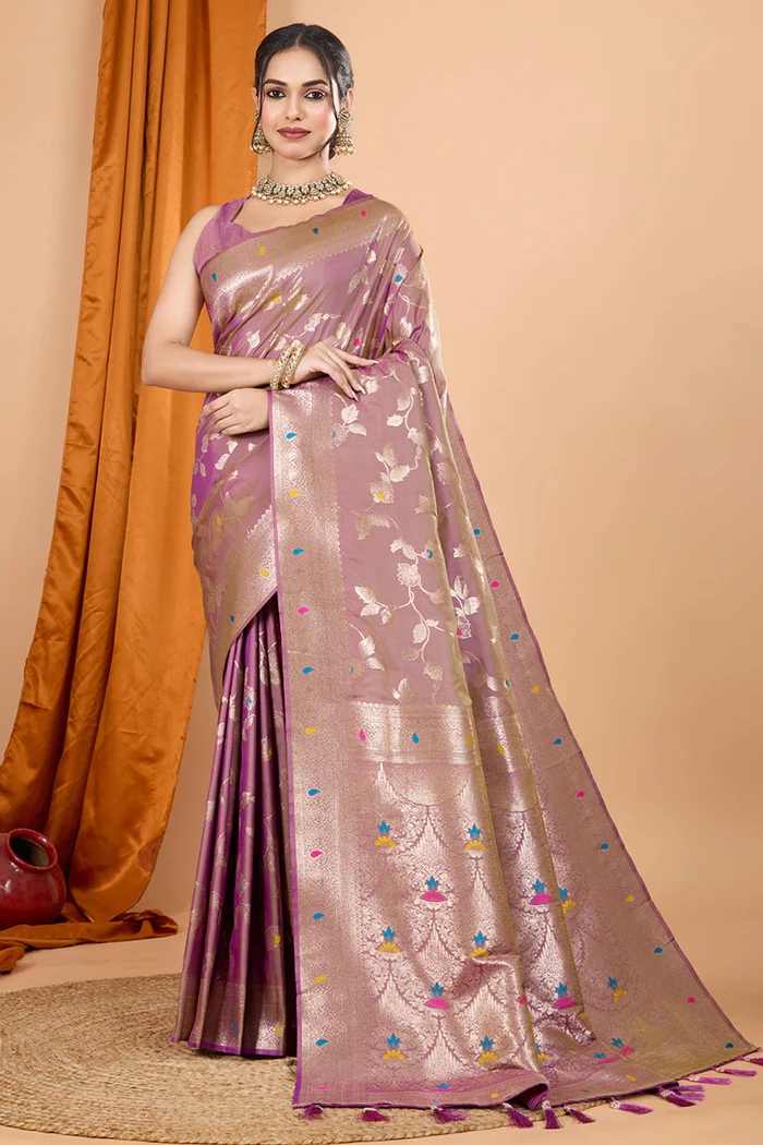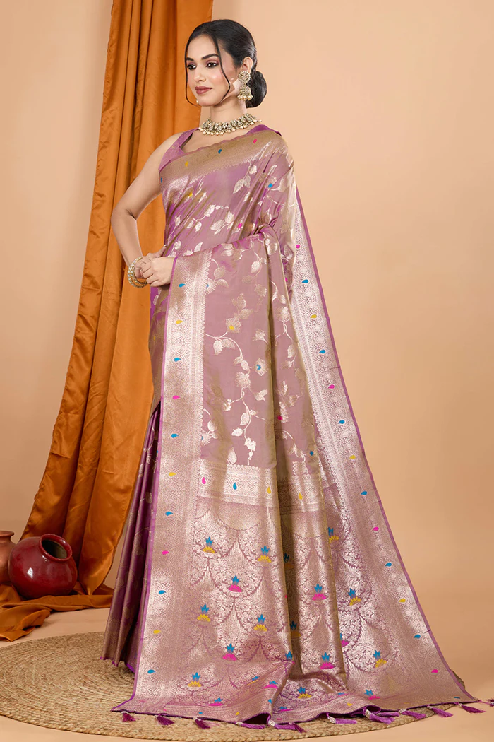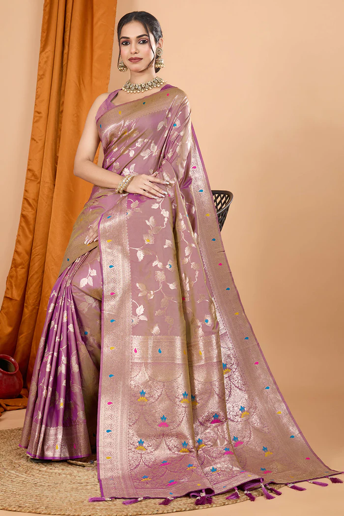 Lavender Banarasi Silk Traditional Saree with Zari Work