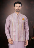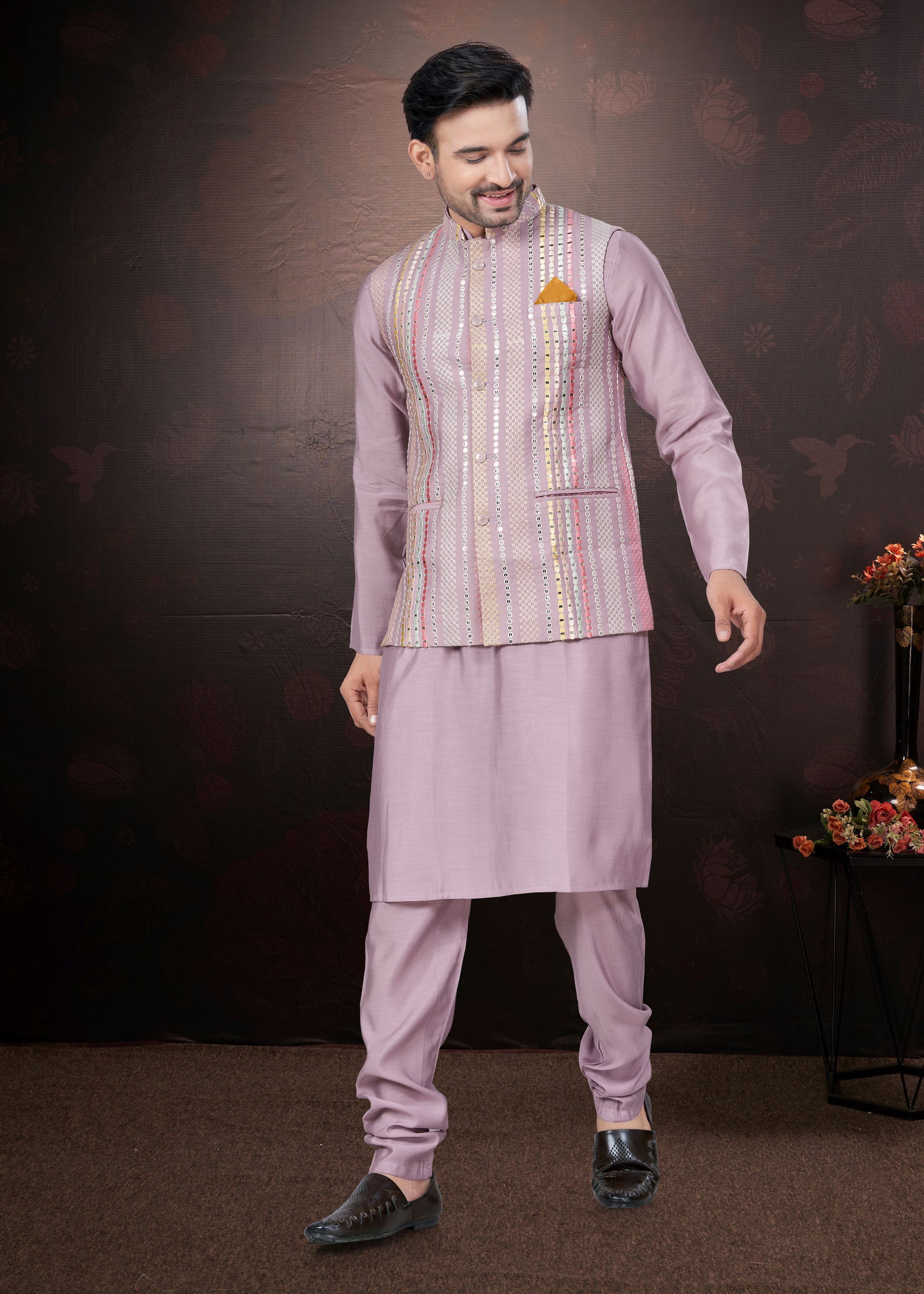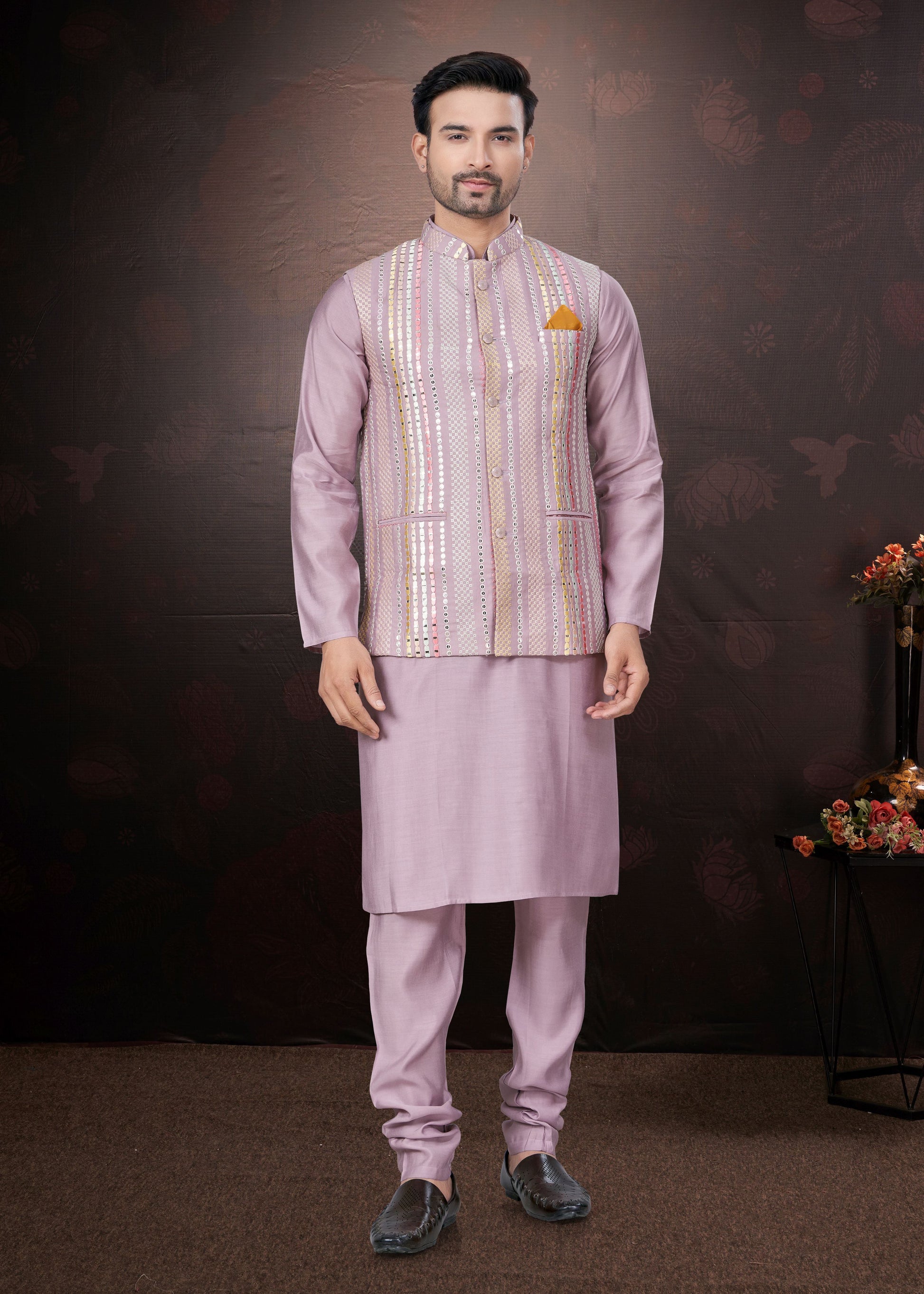 Light Purple Embroidered Silk Kurta Pajama with Nehru Jacket