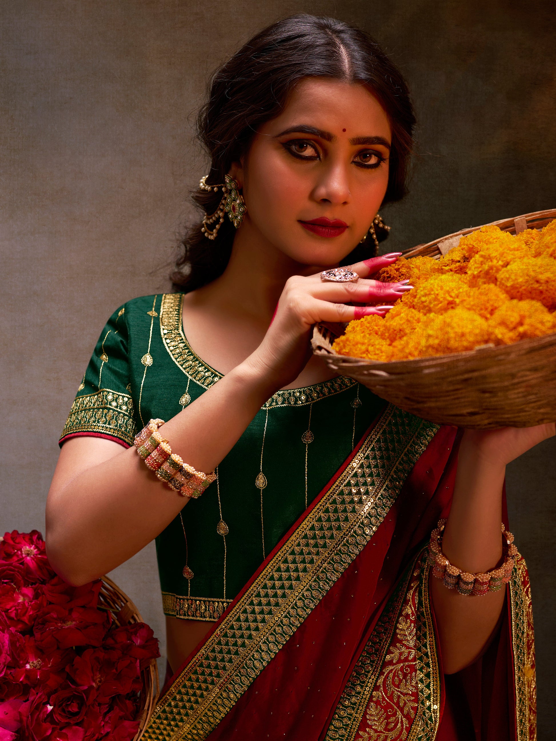 The Maroon Satin Saree with Tassels is beautified with Swarovski Embroidery Work. This festival saree comes with an un-stitched blouse that may be customized up to 44 inches. Note: Due to photographic reasons there might be slight color variation.