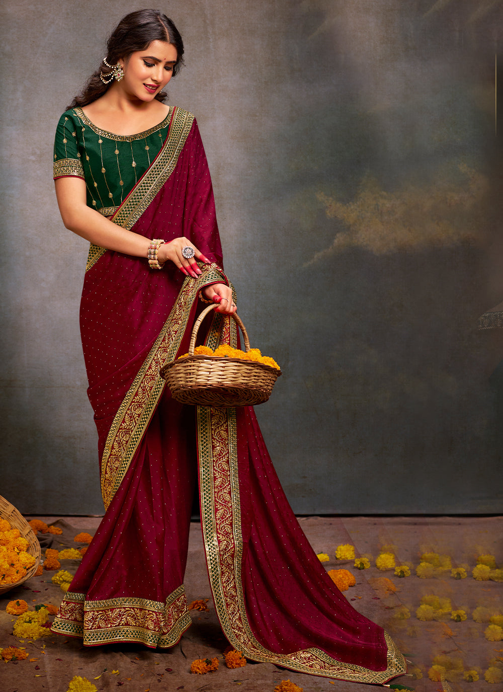 Maroon Swarovski Work Embroidered Satin Saree with Tassels