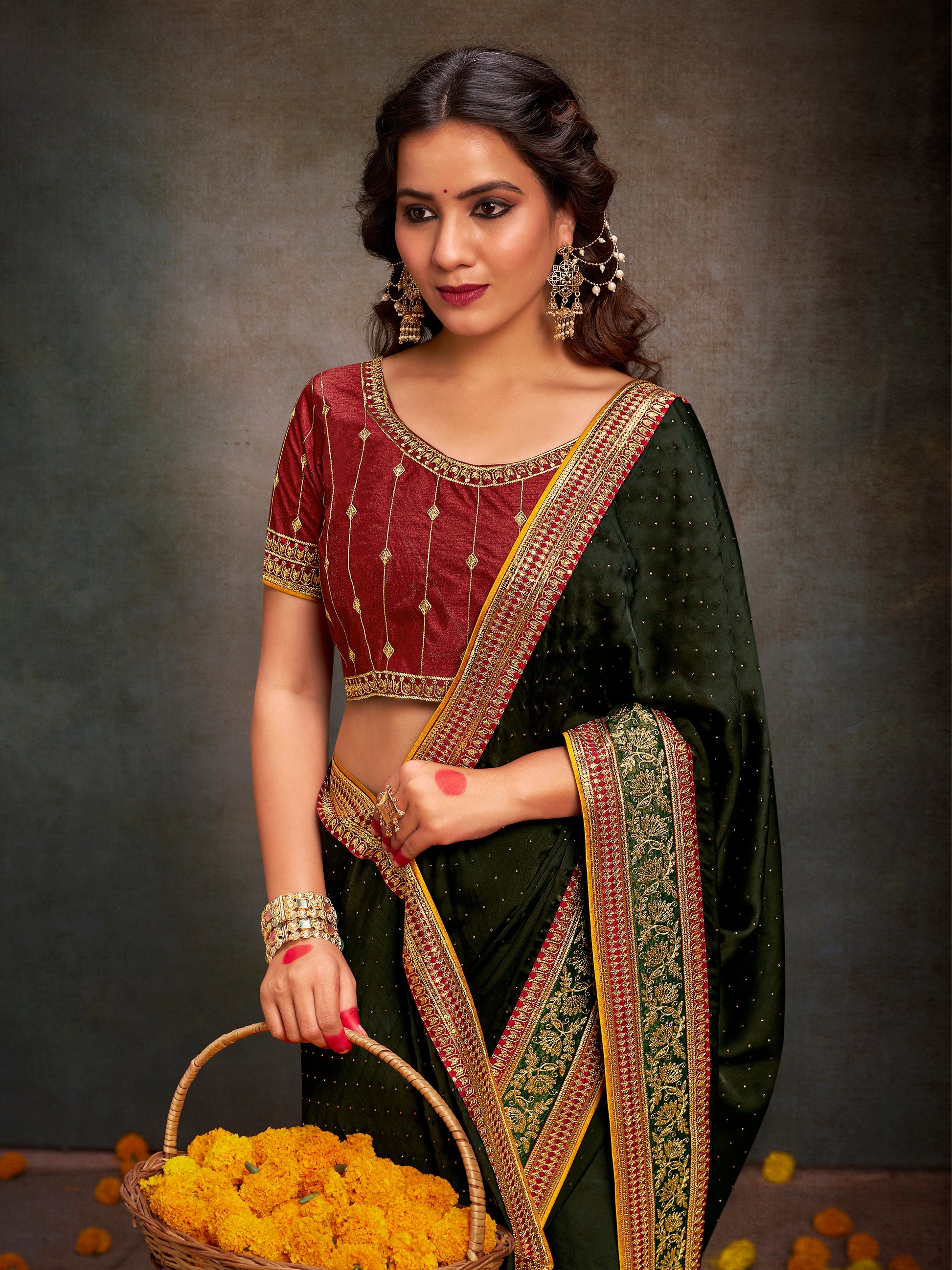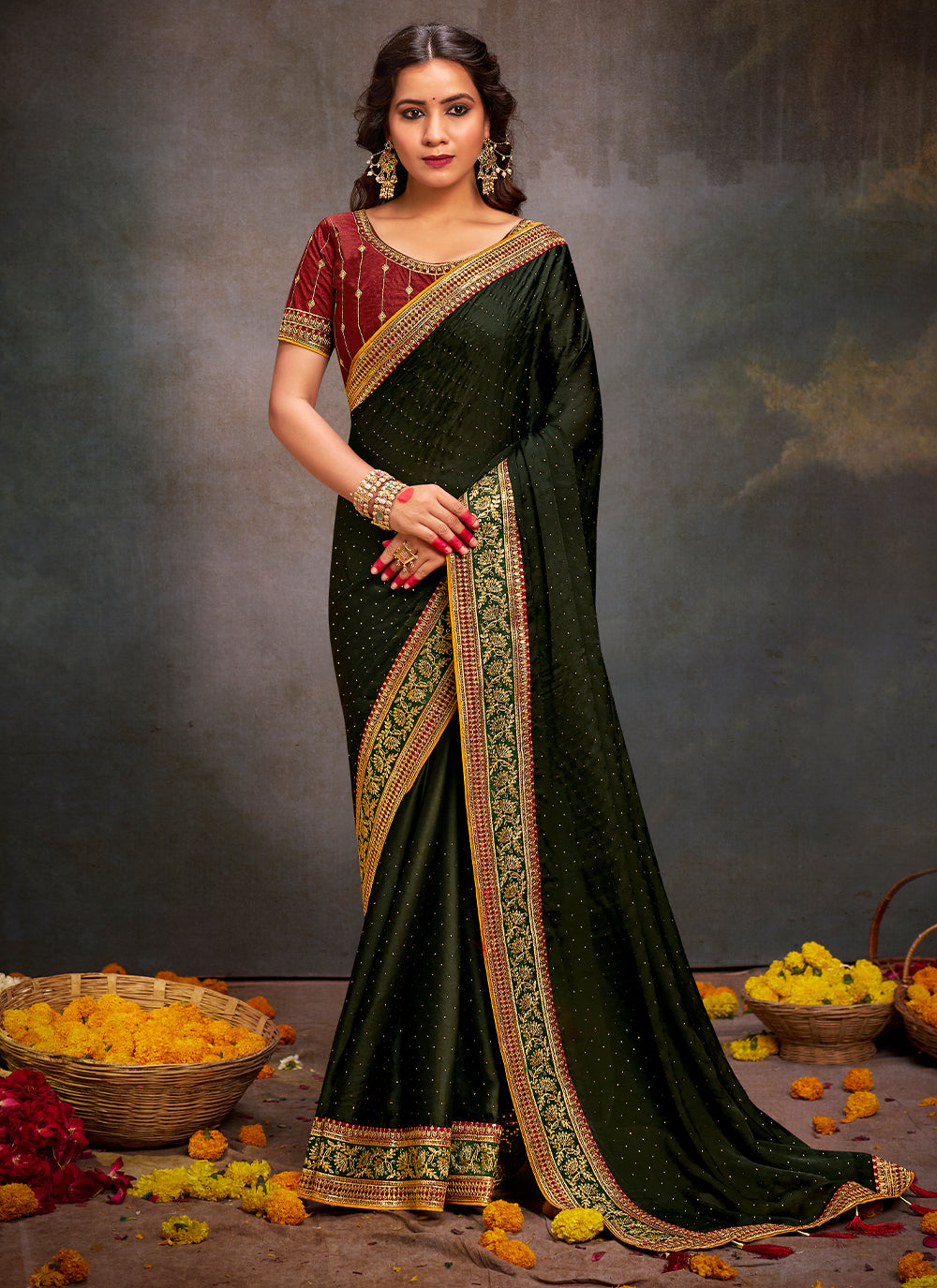 Mehandi Green Swarovski Work Embroidered Satin Saree with Tassels