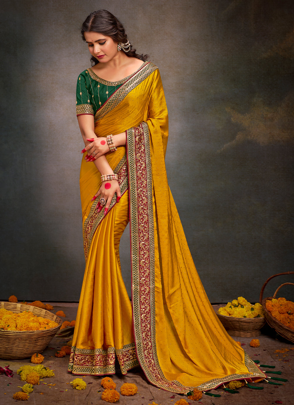 Mustard Yellow Swarovski Work Embroidered Satin Saree with Tassels
