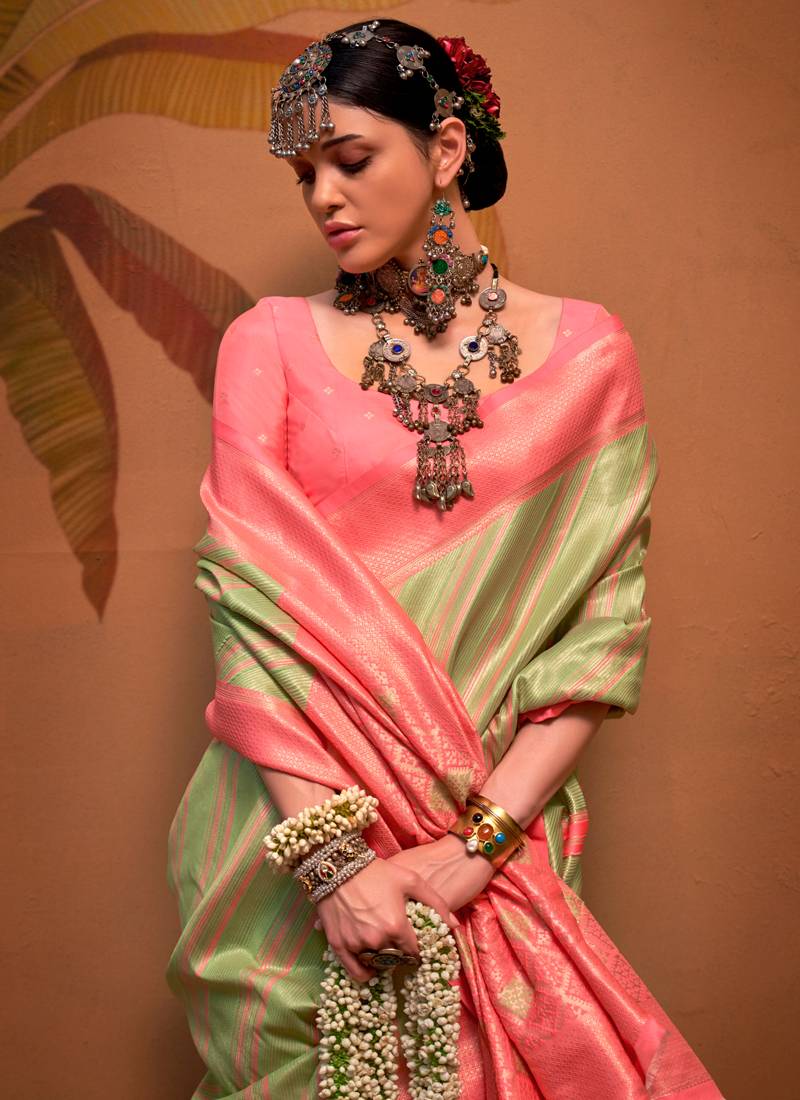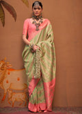 Olive Green and Light Peach Handloom Weaving Silk Saree