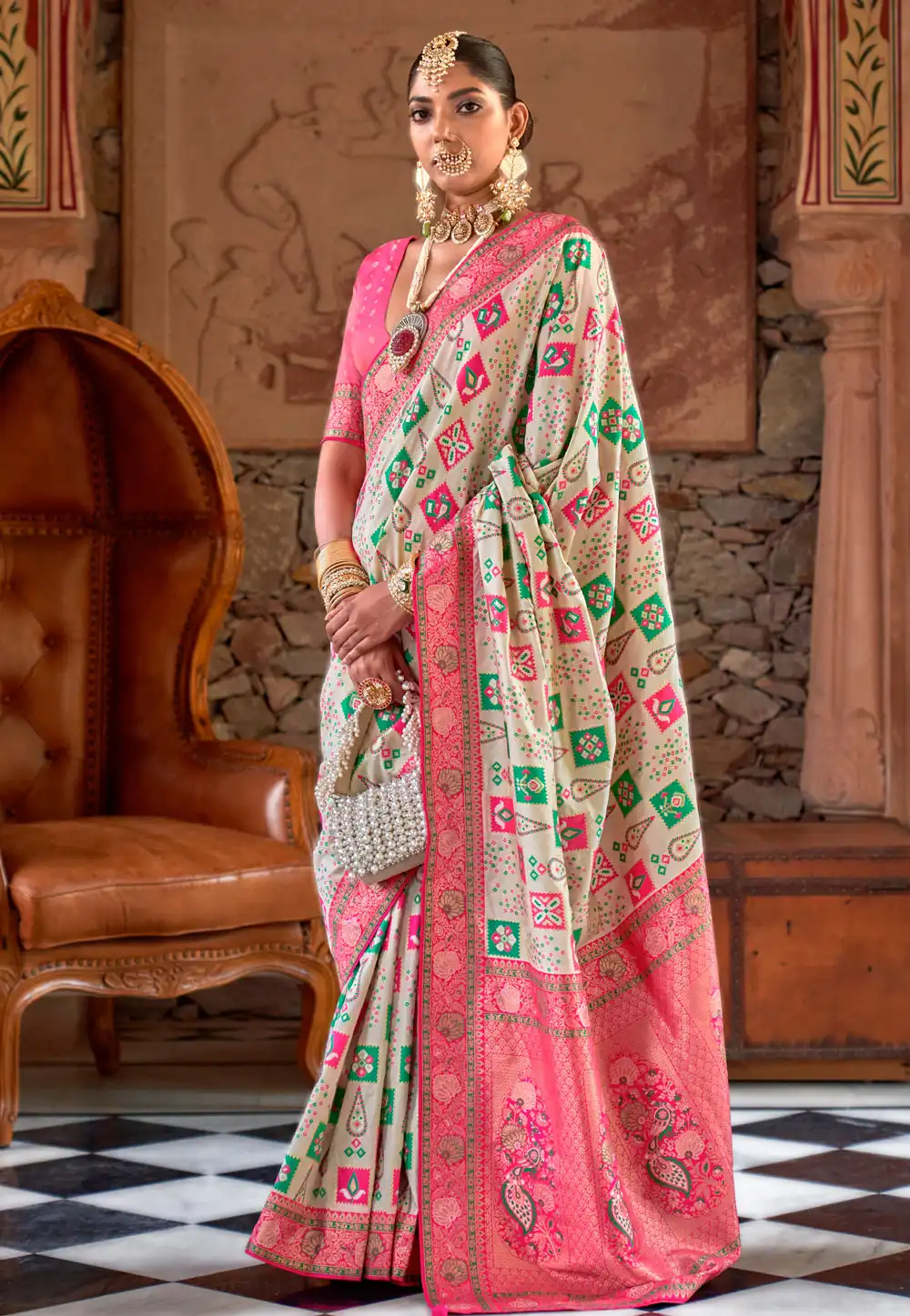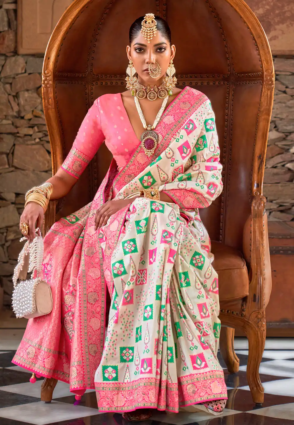 Off White Banarasi Silk Bridal Saree is beautified with Zari Designer Work. This festival saree is made of J.P.W Banarasi Silk and can be worn on occasions like Engagement, Wedding, and Reception. It comes with an un-stitched Zari weaving blouse that may be customized up to 44 inches. Note: Due to photographic reasons there might be slight color variation.