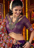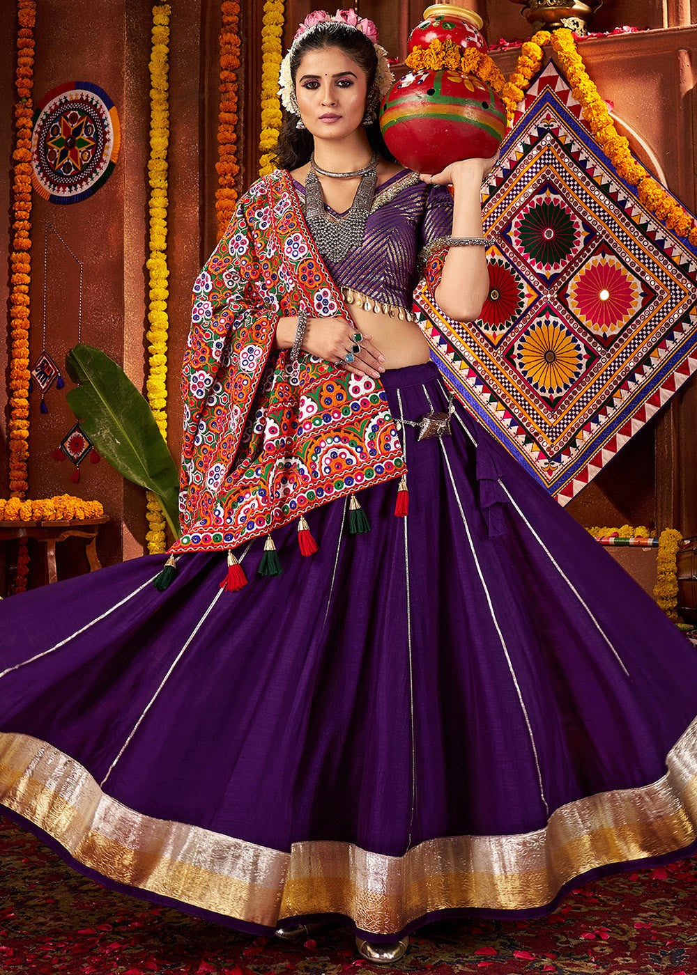 Make a statement this festive season with our Navratri Special Purple Lehenga Choli. The lehenga is crafted from premium silk for a graceful fall, while the blouse is made with breathable viscose cotton for comfort. A soft cotton dupatta completes the look with subtle charm. Detailed with beautiful multi-thread embroidery and delicate mirror work, this outfit brings together traditional artistry and festive flair, perfect for dandiya, Garba, and every joyful celebration. Do Note: All Accessories shown in the images are for styling purposes only and due to photographic reasons there might be slight color variation.