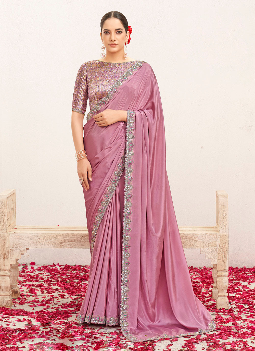 Pink festive saree in crepe fabric, beautified with sequins embroidery and hand work. It comes along with an unstitched blouse of the same color that may be customized up to 42 inches. Note: Due to photographic reasons, there might be slight color variation.