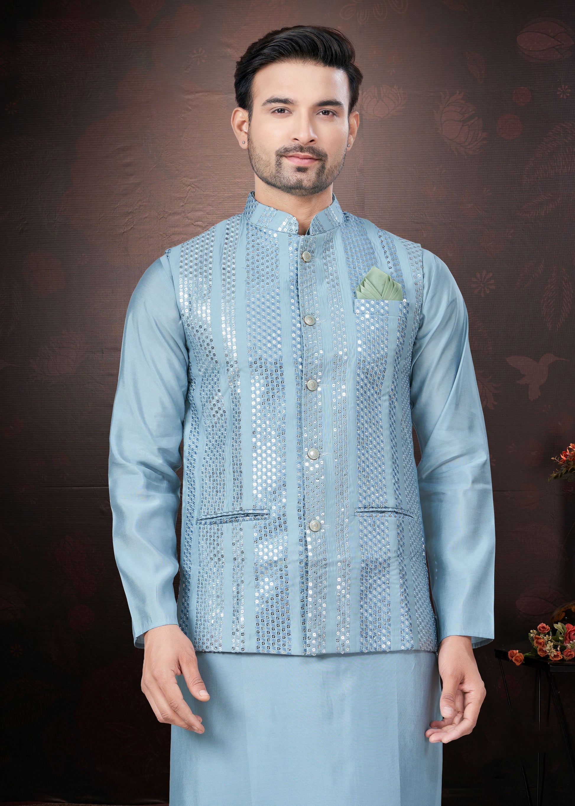 Sky blue party wear mens kurta pajama with nehru jacket is fabricated with mirror work and thread embroidery work. This Indian menswear comes in silk fabric and is available in 6 sizes S(36), M(38), L(40), XL(42), XXL(44), 3XL(46). Note: Buttons shown in the images may vary in design, all accessories are for styling purposes and due to photographic reasons there might be slight color variation.