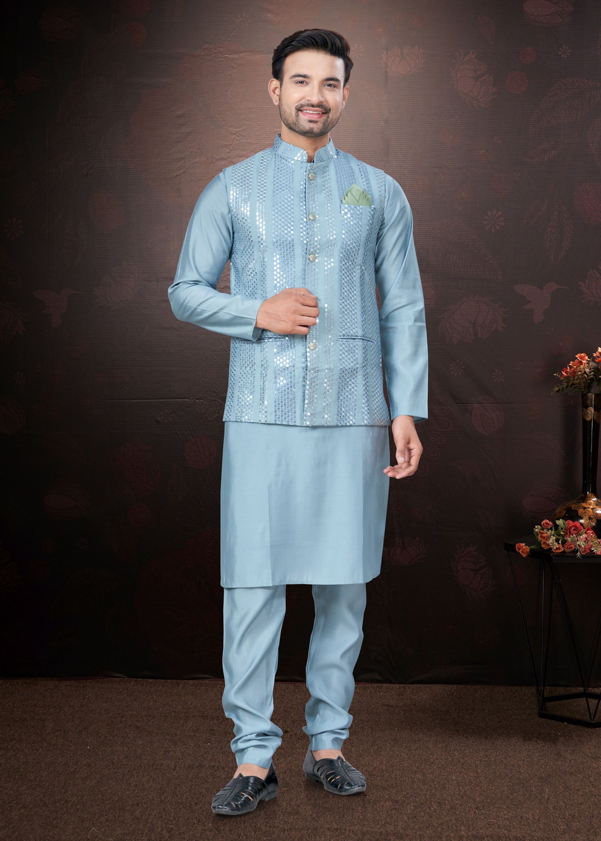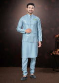 Sky Blue Embroidered Silk Kurta Pajama with Nehru Jacket