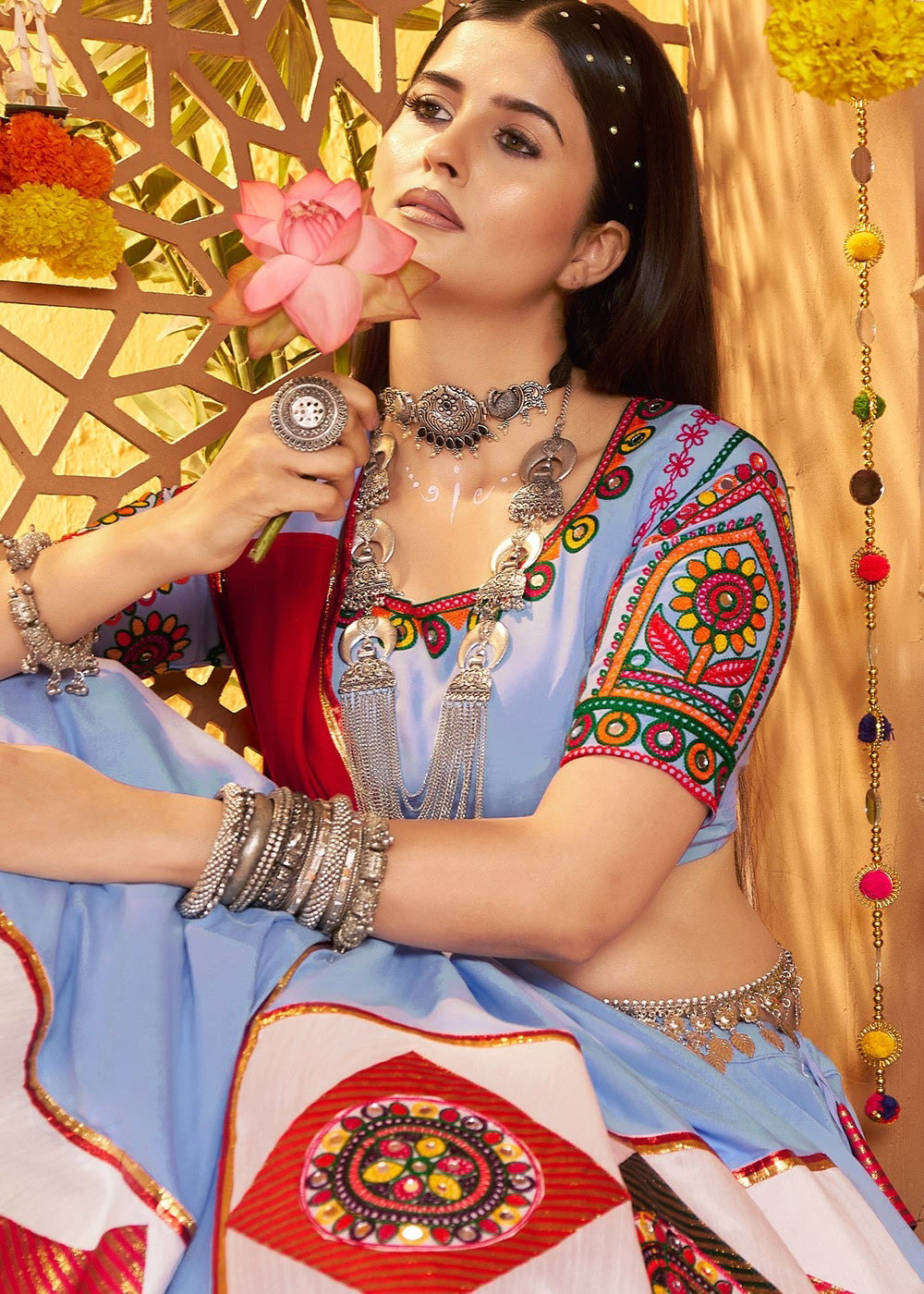 Step into the festive spirit with our stunning Navratri Special Lehenga Choli, crafted in sky blue color that capture the essence of celebration. Made from viscose, this elegant ensemble includes a beautifully designed lehenga, matching blouse, and a graceful dupatta, all tailored for comfort and style. The highlight of this traditional outfit is the intricate multi-thread and mirror embroidery, giving it a rich, designer appeal. Whether you're dancing the Garba or attending a festive gathering, this lehenga choli will make sure you stand out with elegance and charm. Do Note: All Accessories shown in the images are for styling purposes only and due to photographic reasons there might be slight color variation.